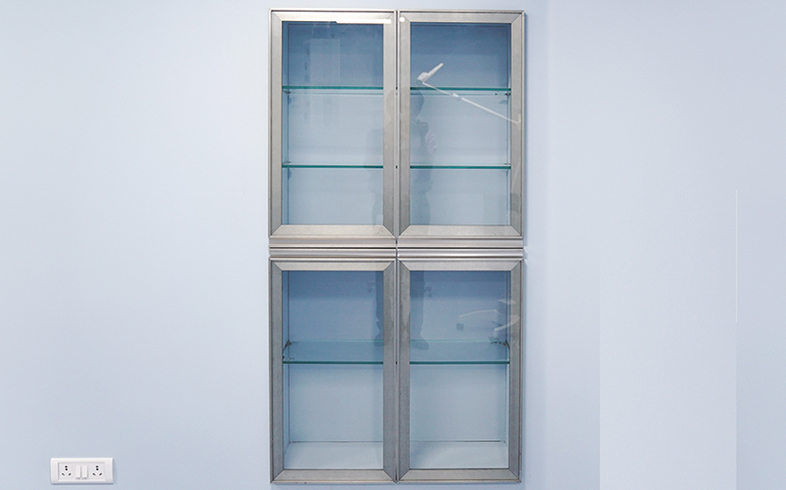 The Storage Unit can be made with 1.50 mm thick EGP Zinc coated steel panels, stainless Steel panels, high pressure laminate panels. The hospital storage unit will be divided in 2 equal parts and each part will have individual glass doors with high quality locking system. Each part will be provided with glass racks